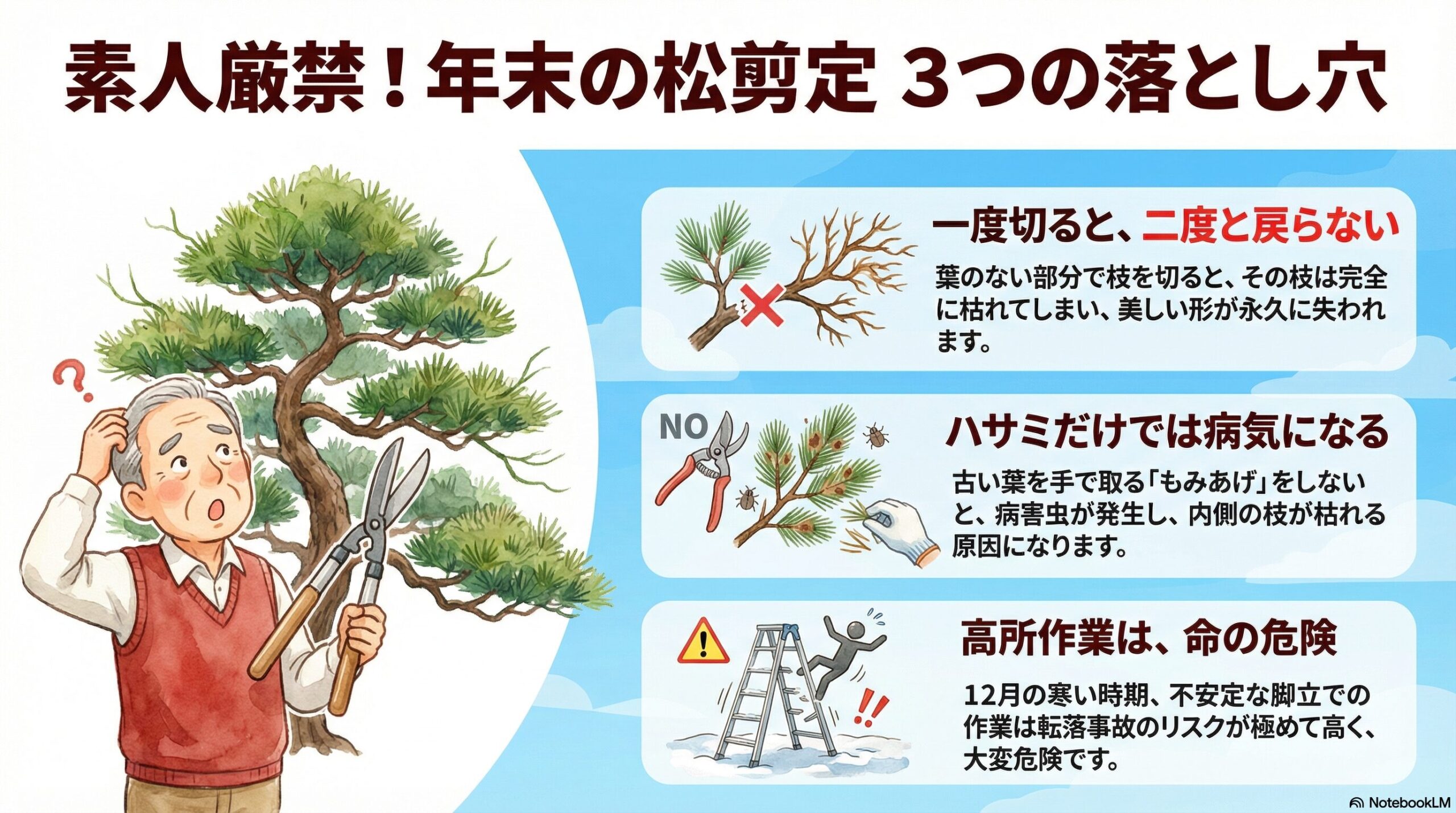 「少し小さくしよう」と思って枝を短く切り詰めた結果、その枝が丸ごと枯れてしまい、美しい松の形(樹形)が永久に失われてしまった…という失敗例が後を絶ちません。